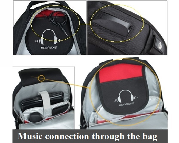 – Connect your music player from inside the bag to the strap with 3.5mm audio jack
